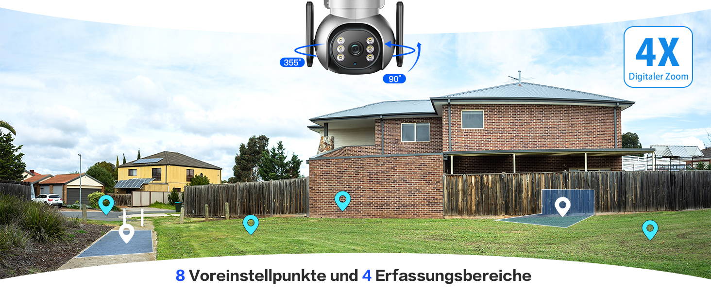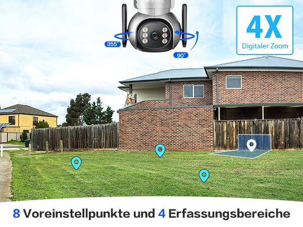 355 Pan 90 Tilt, mehrere benutzerdefinierte Einstellungen Diese SIM-Kamera dreht sich um 355 horizontal und um 90 vertikal mit 4-fachem Digitalzoom, sodass Sie mehr Details und Bereiche sehen können. Diese externe SIM-Kamera unterstützt viele benutzerdefinierte Einstellungen, wie z. B. Mehrbenutzer-Sharing, 4-in-1-Bildschirm, benutzerdefinierte Alarm, benutzerdefinierte Erkennungsempfindlichkeit, bestimmte Erkennungsbereiche, geplante Aufnahme und so weiter.